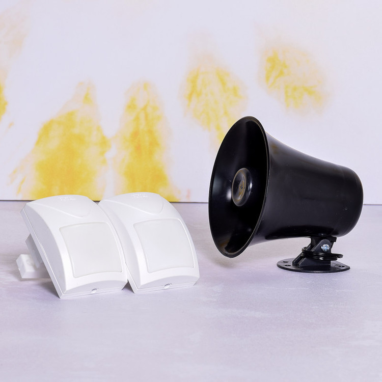 دو عدد ریموت کنترل از راه دور دو عدد چشمی حرکتی یک عدد باطری 7.5 آمپر یک عدد بلندگو یک عدد کاور فلزی