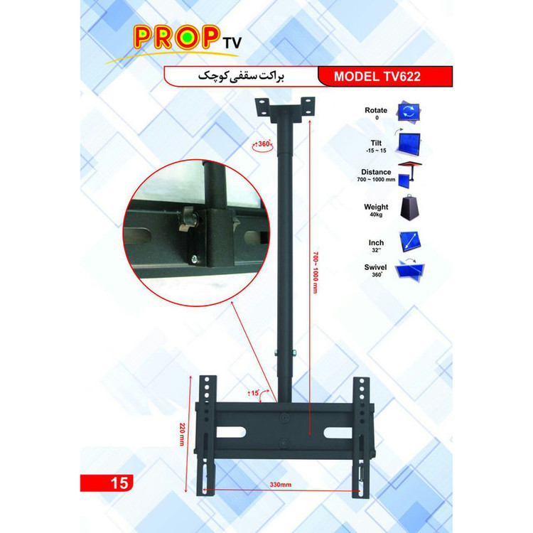 براکت سقفی و متحرک تلویزیون مدل TV622 تحت استاندارد VESA با قابلیت تحمل وزن 40 کیلوگرم می باشد.این براکت مناسب برای مکانهایی است که کاربر نیازمند چرخش افقی کامل تلویزیون باشد. این پایه سقفی معمولا کاربرد های فراوانی (مانند سالن های انتظار، کارخانه جاتها -شرکت – فرودگاه – بیمارستان – پایانه ها و اتاق های رادیولوژی یا سونگرافی و جراحی وآزمایشگاهی و خطوط کنترل کارخانه و ….. دارد. برای تمام برندها وهمچنین تمام تلویزیون های (LCD-LED-(OLED و منحنی و پلاسما کاربرد دارد. این پایه به وسیله شاخک هایی که دارد به پشت تلویزیون شما بسته خواهد شد و برروی پایه نصب میشود .از این پایه سقفی می توان برای تلویزیونهای 24 تا 32 اینچ استفاده کرد.علاوه بر زیبایی خاصی که دارد، تنظیم ارتفاع تلویزیون از سقف بطور همزمان با پایه از عملکرد بی نظیر آن می باشد، و مزیت بسیاری برای کاربرانی را دارد که می خواهند ارتفاع تنظیم تلویزیون خود متغیر باشد.